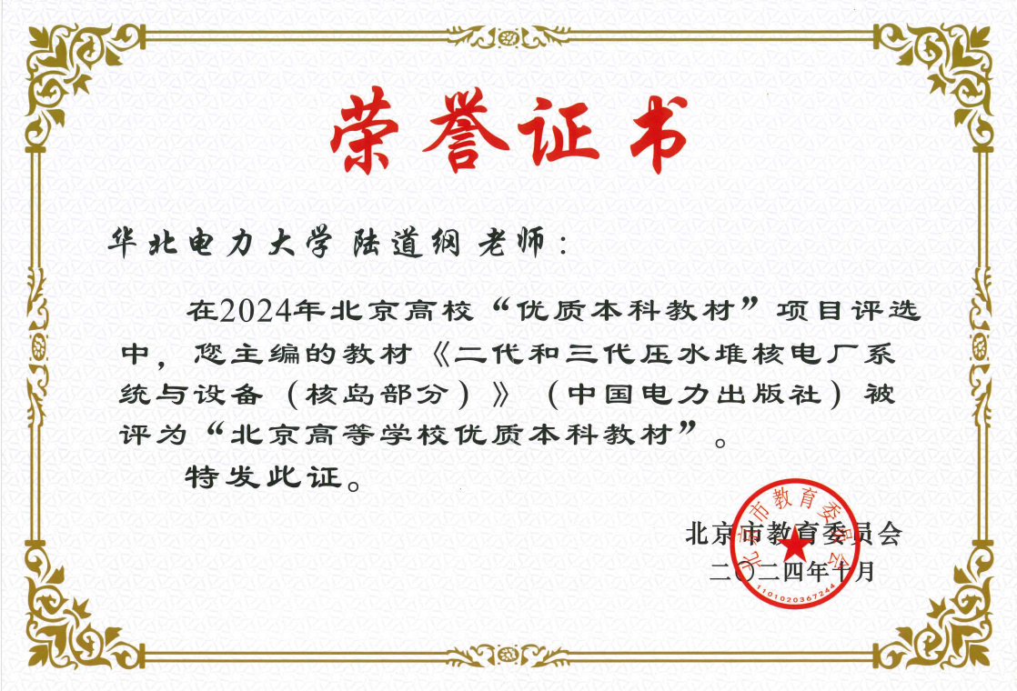《二代和三代压水堆核电厂系统与设备(核岛部分)》是我校核工程与核技术和辐射防护与核安全专业“核电厂系统与设备”课程的制定教材。该教材由我校陆道纲教授主编,于2023年由中国电力出版社出版,获评“北京高等学校优质本科教材”和全国电力行业“十四五”规划教材。